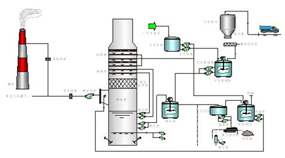 雙堿法脫硫工藝,由燃煤鍋爐(如電廠)產(chǎn)生的煙氣通過前級除塵器(電除塵器或布袋除塵器)進(jìn)行與除塵,經(jīng)與除塵后的煙氣由引風(fēng)機(jī)送入吸收塔進(jìn)行脫硫,吸收塔內(nèi)布置有多層噴頭,可噴出含有脫硫劑的水霧,煙氣中的SO2與吸收液進(jìn)行充分反應(yīng)、接觸后,沉降到塔底并流入灰水循環(huán)系統(tǒng)中,吸收后的吸收液經(jīng)再生劑重生后,沉淀的渣漿由渣漿泵送入渣漿處理系統(tǒng),進(jìn)行濃縮、過濾,得到石膏,濾液和沉淀后的上清液經(jīng)PH調(diào)節(jié)和補(bǔ)水后,供水泵循環(huán)利用,形成灰水壁爐循環(huán),既防止二次污染,又降低耗堿量和運(yùn)營成本。脫硫除塵后的煙氣經(jīng)高效除霧器除去其中的過飽和水分,既防止二次污染,又降低耗堿量和運(yùn)營成本。脫硫除塵后的煙氣經(jīng)高效除霧器出去其中的過飽和水分,達(dá)到排放標(biāo)準(zhǔn)后經(jīng)煙囪排入大氣。 |